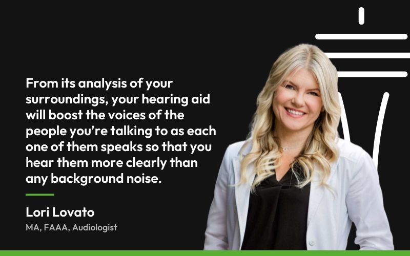 From its analysis of your surroundings, your hearing aid will boost the voices of the people you’re talking to as each one of them speaks so that you hear them more clearly than any background noise.